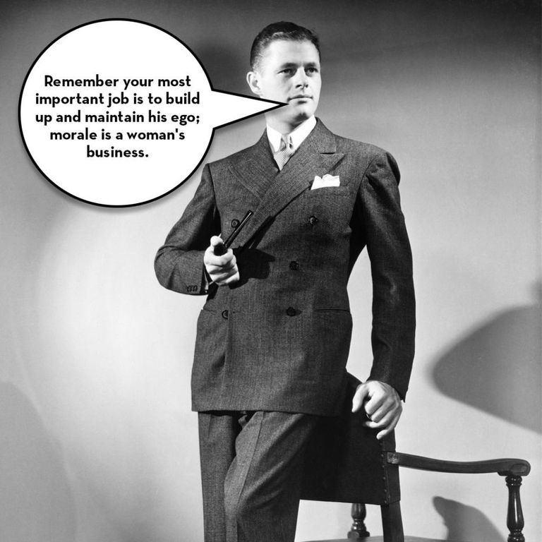 And just in case you didn’t get the message that your problems are dumb and no one wants to hear them, he added this reminder: “Remember your most important job is to build up and maintain his ego; morale is a woman’s business.”