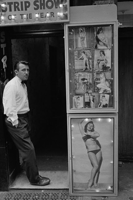 A man at the entrance to a strip club in Soho, London, April 1961.