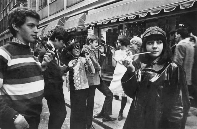 Fashionable young Londoners smoking pipes and cigarettes in long holders on a Soho street in 1965.