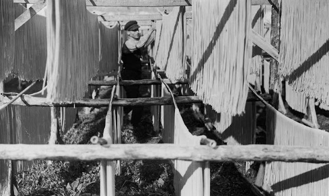 | Pasta strands hung out to dry at a factory in Naples, Italy, 1925. |