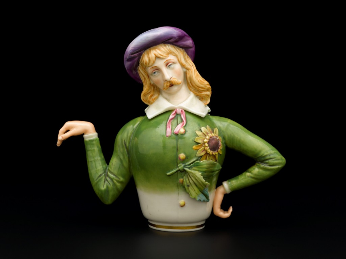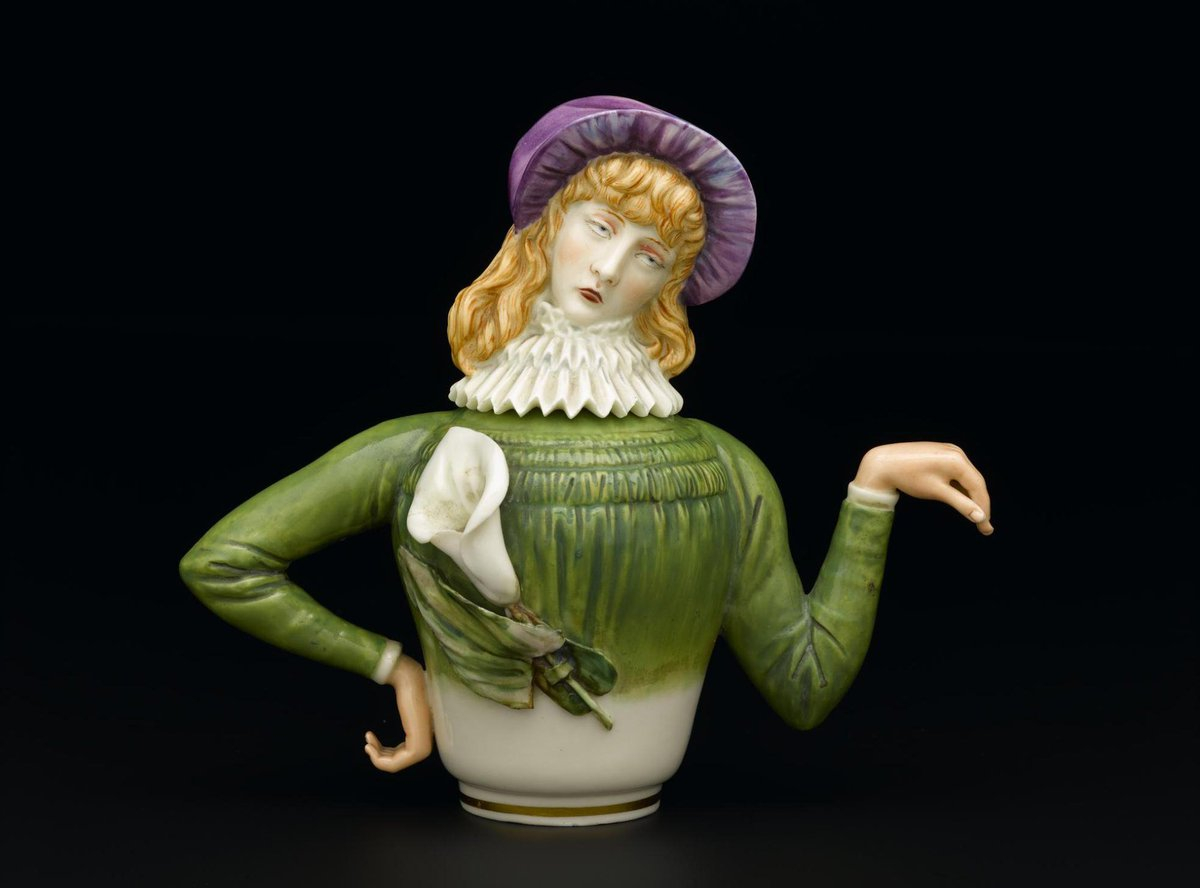 Everything is not as it seems with this quirky two-faced teapot by Royal Worcester. Created in 1882, one face depicts a flamboyant young man dressed as a dandy and adorned with a sunflower, while its other face shows a woman wearing a lily.