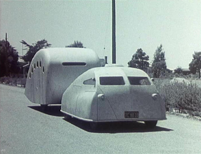 Built in 1935 by Angelo R. Noble just north of Los Angeles, it clearly takes its influence from the other streamlined products of the 1930s. And despite looking vaguely like a tank, it seems like it’d be a disaster in a car wreck. Especially since it was built to tow a “streamlined” camper, adding plenty of weight to an already wobbly design.