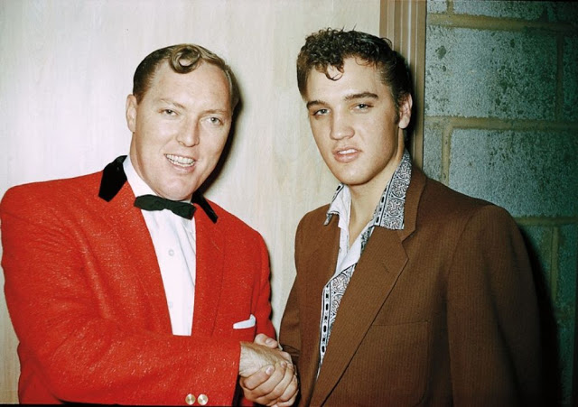 The renowned photo of Elvis Presley and Bill “Rock Around the Clock” Haley, snapped by deejay Tommy Edwards on October 20, 1955, during the filming of the inexplicably lost documentary, The Pied Piper of Cleveland.