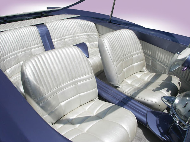 This one-of-a-kind, award-winning effort is simply stunning with its scooped, full teardrop skirts front and rear, pancaked hood, rolled and pleated pearl white Naugahyde interior and razor-like tailfins. The radical interior, complete with its aircraft control yoke-inspired steering wheel and bulbous dash pod, “Beatnik” is a wheeled tribute to the late 1950s and early 1960s – and it’s truly the work of an artist practicing his developed craft in the medium of metal.