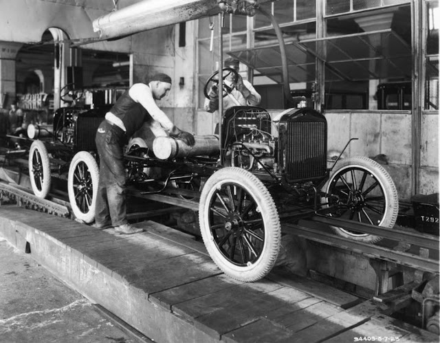 When deciding to implement the assembly line, neither Sorensen nor Henry Ford nor anyone else involved had the benefit of time-motion studies. They simply reasoned that moving the component at a fixed rate past each station would reduce the number of workers required to build the cars, reduce the time required for assembly, increase volume, and allow the company to control the pace.