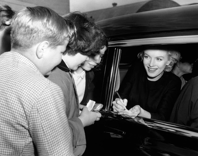 Marilyn was almost always happy to sign autographs, pose for photographs, or do a twirl for an 8mm movie camera. Wherever she went, the fans were there. Within hours of her arrival at a hotel, the press got wind of the fact, and soon enough there were hundreds of fans outside. They were waiting for her to appear, hoping to catch a glimpse, snap a photo, or get an autograph. She was known to be pursued into restrooms, with fans passing autograph books under the cubicle. In New York, Marilyn even had a group of hardened fans known as the “Marilyn Six,” who kept up a vigil for Marilyn whenever she was in town.