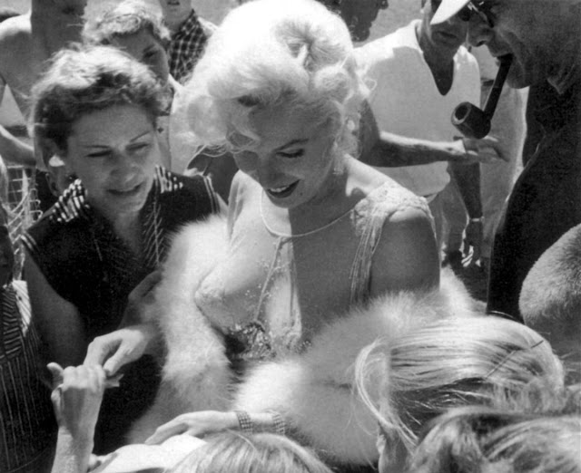 In his autobiography Timebends, Arthur Miller described how Marilyn worked her fans: she could handle a crown “as easily and joyfully as a minister moving among his congregation. Sometimes it was as though the crowd had given her birth; I never saw her unhappy in a crown, even some that ripped pieces of her clothes off as souvenirs.”