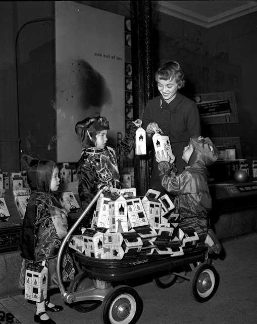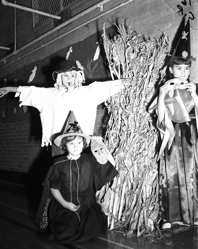 Halloween in the 1950s was a far different holiday than today; no big box stores, just the five and dime and Woolworth’s. Very few kids had ever seen a store bought costume let alone owned one. The big scares for the night were pushing over someone’s outhouse, stealing a melon or two and running through the neighborhood in large packs of very mixed age groups.