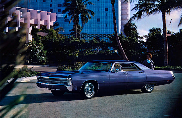 The “Fuselage Look” was how Chrysler described its new styling for 1969. Instead of the square lines of 1964-1968 models, the new Imperials featured rounded “tumblehome” sides, bulging at the beltline like an airliner’s “fuselage” and tucking in down to the rocker panels. The new styling made the cars look longer and wider, and strongly curved side glass increased shoulder room without expanding overall body width compared to the previous C-body. Front and rear shoulder room increased from 59.4 in (1,509 mm) to 62.7 in (1,593 mm) on 4-door hardtops.