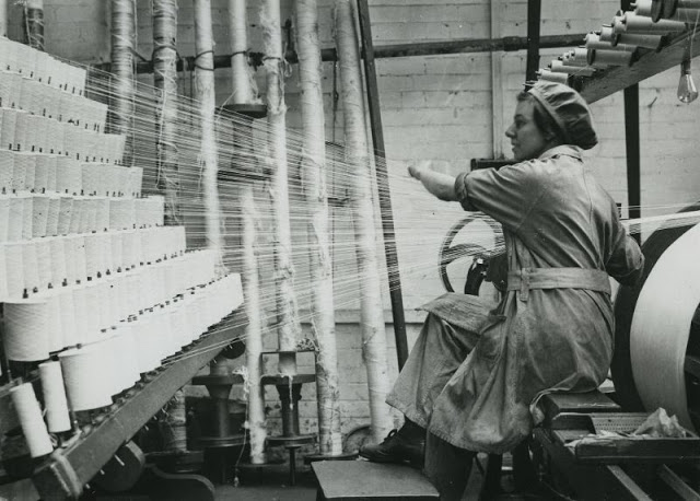 British woman winding cotton from spools on to rollers at lace factory in Nottingham