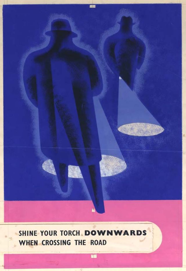 A road safety poster in a strong modern graphic style, depicting two shadowy civilian men shining their torch as they cross each other in the road. The slogan is direct and to the point: ‘Shine your torch downwards when crossing the road’ so as not to blind drivers and other pedestrians in the blacked out streets. The poster was illustrated in Art & Industry in July 1943, as an example of posters that had been displayed in a recent poster exhibition.
