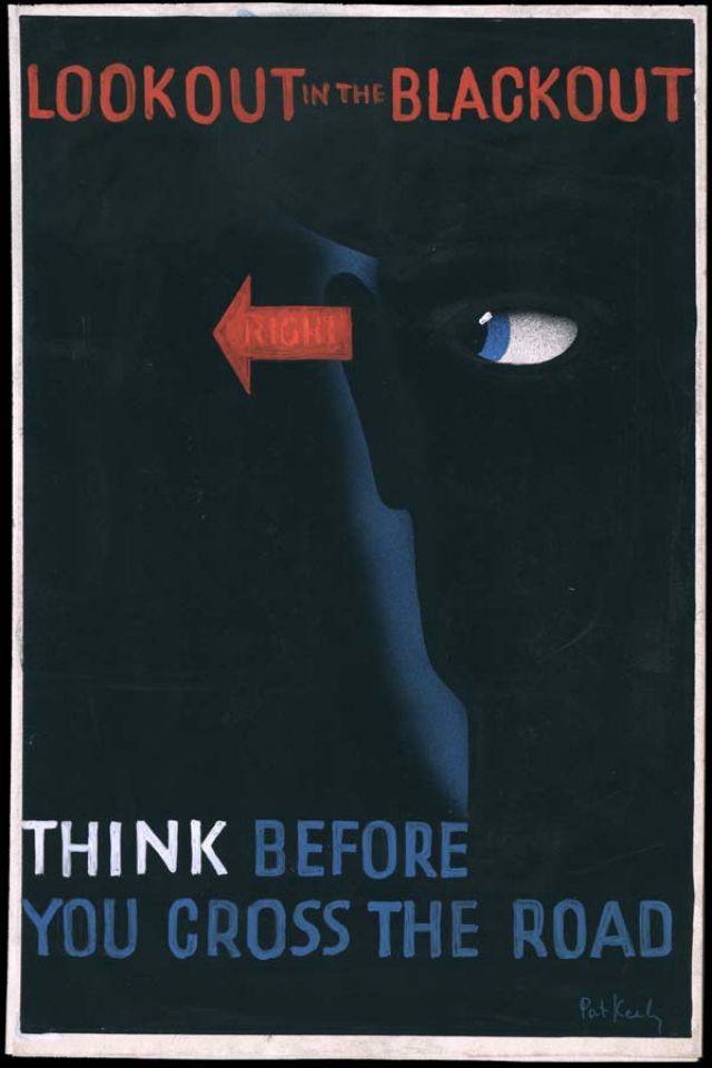 A road safety poster, depicting a man’s head wearing a hat with his eye looking right (following the direction of the arrow), appearing from the gloom of the night. The ‘lookout in the blackout’ campaign first originated in February 1940, due to the number of fatal accidents in the blackout. The campaign, initially only in the press, but with posters in the planning stages, was issued under the guidance of the Ministry of War Transport.