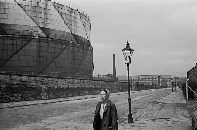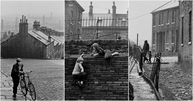 Nick Hedges first visited Bradford for Shelter in May 1969 and was met by rain, creating his first striking black and white images of, as he describes them, “a rain soaked street, the backyards with their slab covered outside lavatories and coal houses, and an alleyway glistening”. His photographs express the strong links between domestic life and industry, mothers pushing prams and children playing football against a skyline of factory chimneys. He also captures Bradford’s geography, with steep roads running down to the city center.