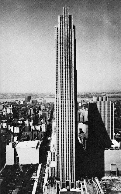 The new 70-story R.C.A. Building dominates the new Rockefeller Center complex, in this view looking west from the top of 444 Madison Avenue Building, 1933. Photo: Rockefeller Center, Inc.