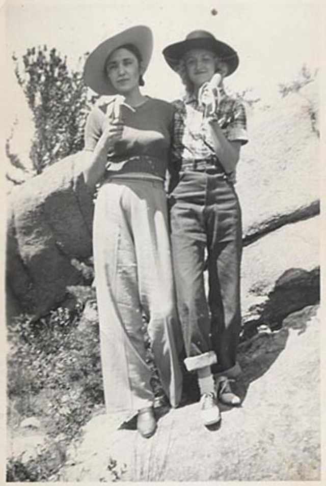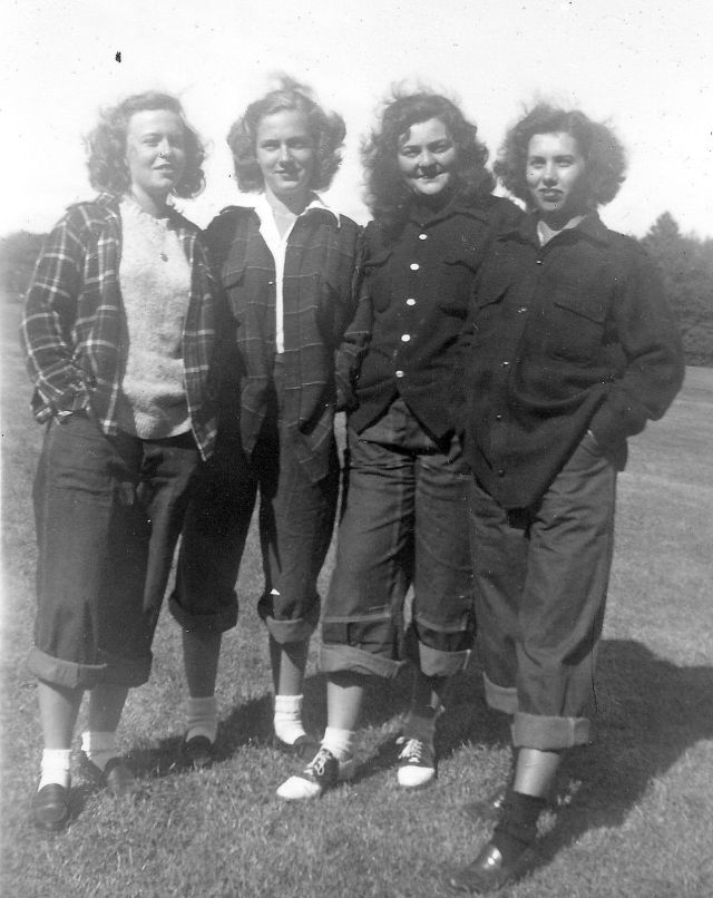 Overall and blue jeans, called dungarees, were a necessary clothing item for laborious tasks. WWII made blue jeans more popular as working Rosies took to factories and Land Girls worked farms.