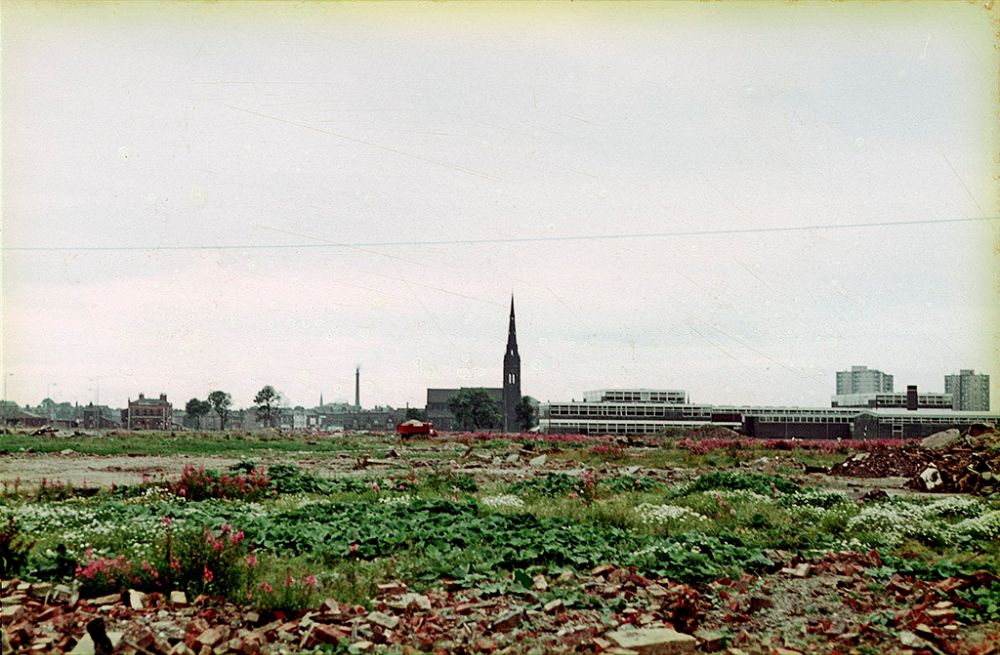View over Hulme looking south west towards St Mary’s church around 1967, showing the extensive area cleared in readiness for redevelopment. The then newly built South Hulme High School (later Birley High School) can be seen to the right of the church.
