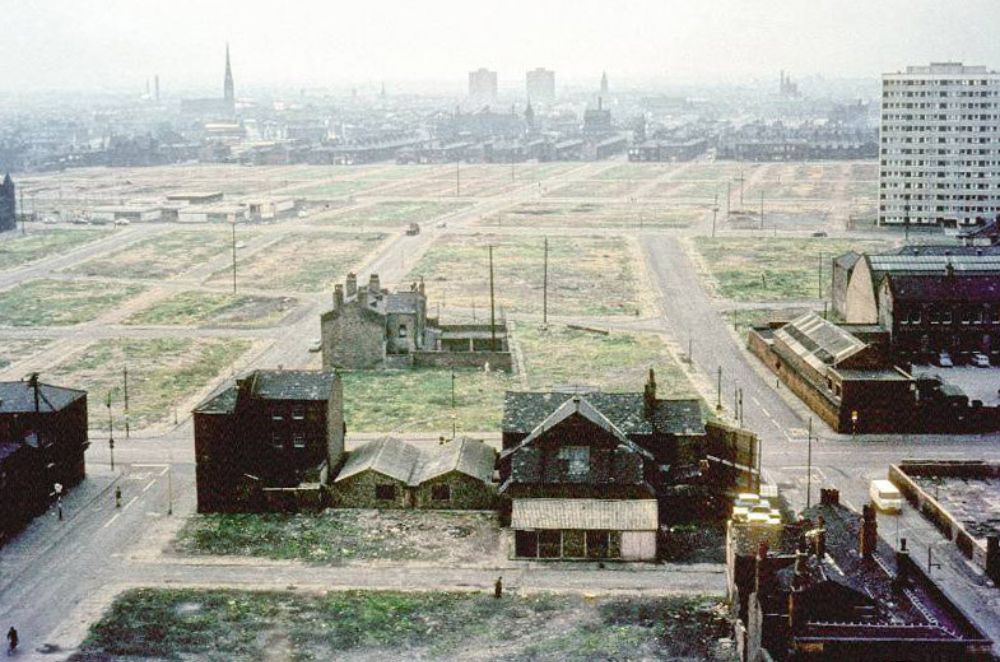 View across Hulme showing areas cleared for redevelopment. Taken from the extension to the Manchester College of Art and Design (the current Chatham Building) around 1966.