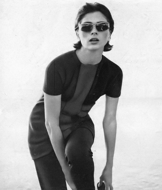 Suzy Parker in olive green wool knit tunic striped in red over tailored olive pants by Gino Paoli, sunglasses by Renauld of France, photo by Richard Avedon, Harper’s Bazaar, June 1962