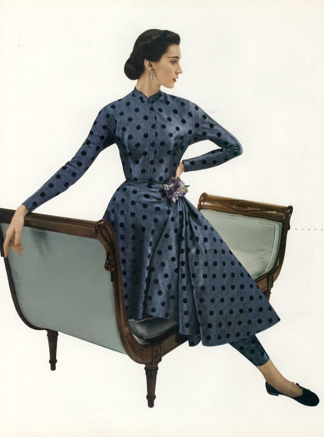 Dovima in an at-home costume of Celanese duo-tone panne satin by Jane Derby, Vogue, December 1, 1950