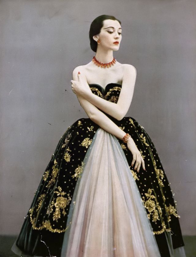 Dovima in Dior’s ball gown of tulle and velvet embroidered with sparkling flowers, the velvet overskirt hooks on and off, photo by Richard Avedon, Harper’s Bazaar, December 1950