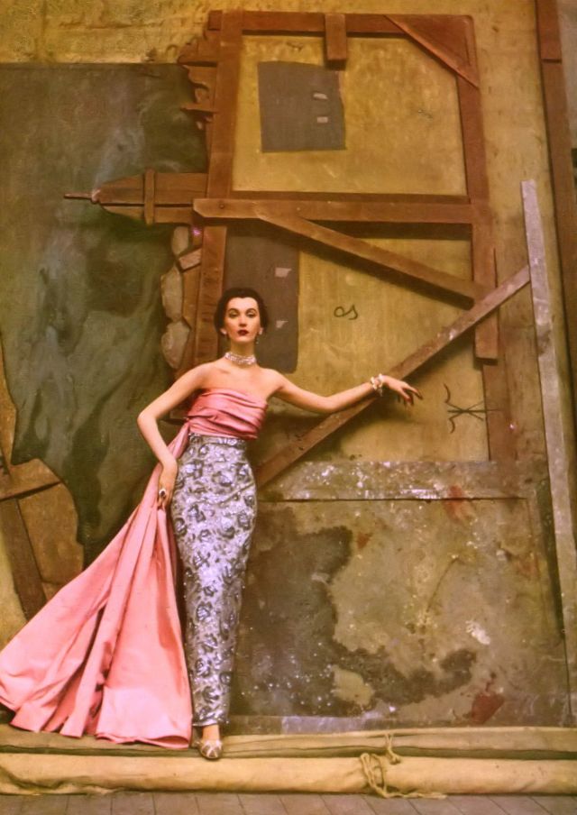 Dovima in gray embroidered tulle sheath with pink faille sash that falls in wide panel by Balenciaga, photo by Richard Avedon, Harper’s bazaar, November 1950
