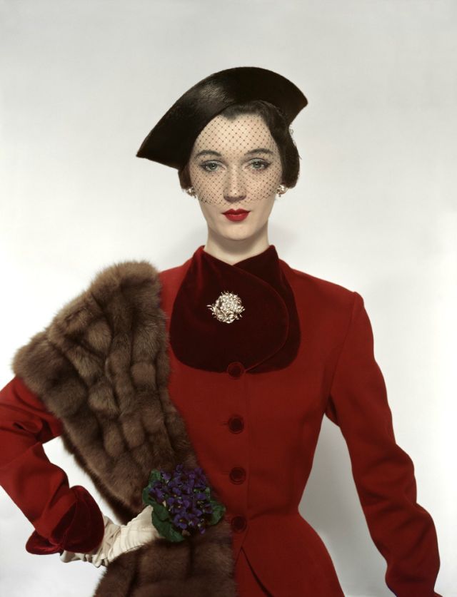 Dovima in Pacific Craft Fabric woolen suit trimmed in velvet, hat by Lilly Daché, and brooch by Verdura, photo by Erwin Blumenfeld, Vogue, August 1, 1950