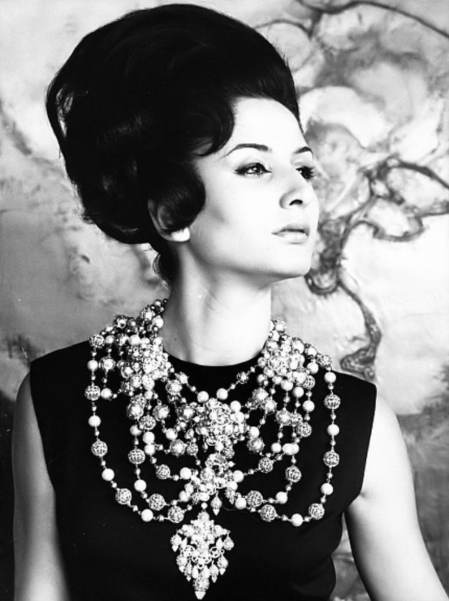 Nati Abascal wearing ornate filigree necklace from Elvira Lucena, a Madrid boutique, photo by Henry Clarke, Vogue, 1964