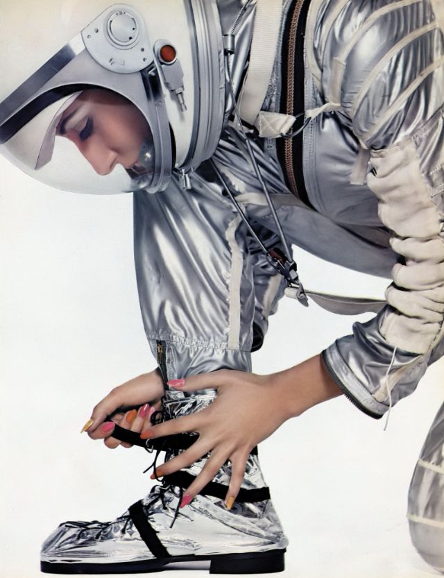 Nati Abascal in a space suit is wearing chromotone nail enamels by Fabergé, photo by Richard Avedon, Harper’s Bazaar, April 1965
