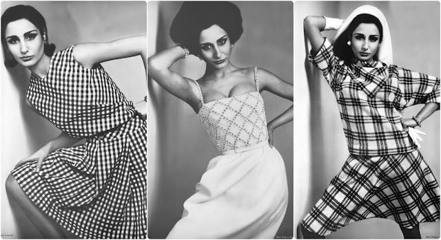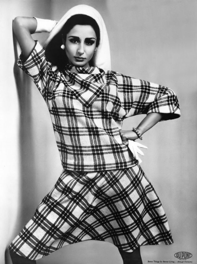 Nati Abascal in black-white plaid knit two-piece, top is dolman-sleeved, by Ricano, hat by Lilly Daché, photo by Richard Avedon, Vogue, April 1, 1965
