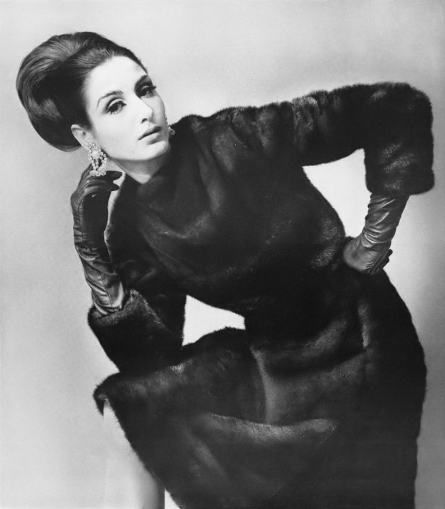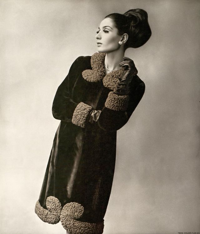 Nati Abascal in Fouke-Dyed “Matara” Alaska fur seal coat by Georges Kaplan, Harper’s Bazaar, October 1965