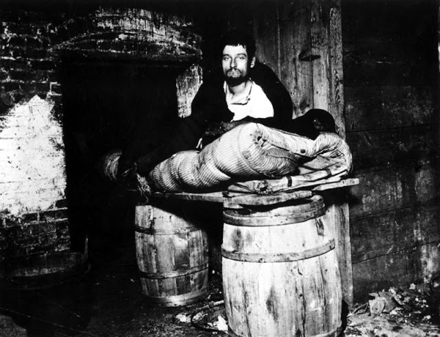 | A peddler sits on his bedroll, atop two barrels, in the filthy cellar he lives in, New York, 1886 |