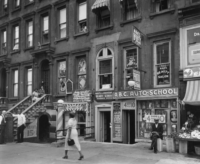 Harlem Street: II. 422-424 Lenox Avenue, Manhattan. Women sit on steps of house that serves as a church, with barber- shop below, white man talks to barber, beauty shop, and auto school next door.