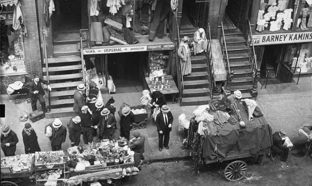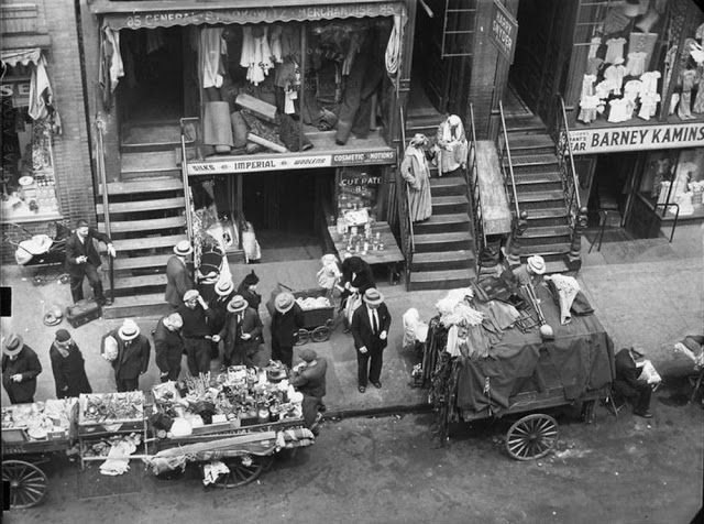 Hester Street, between Allen and Orchard Streets, Manhattan. Looking down from window on street scene including peddlers, women sitting on stoop, baby carriages, fabric and clothing stores and pedestrians.