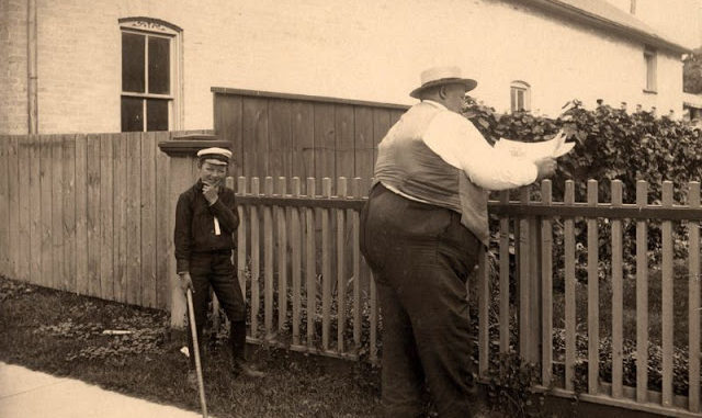 A boy holding a stick contemplates hitting backside of a large man