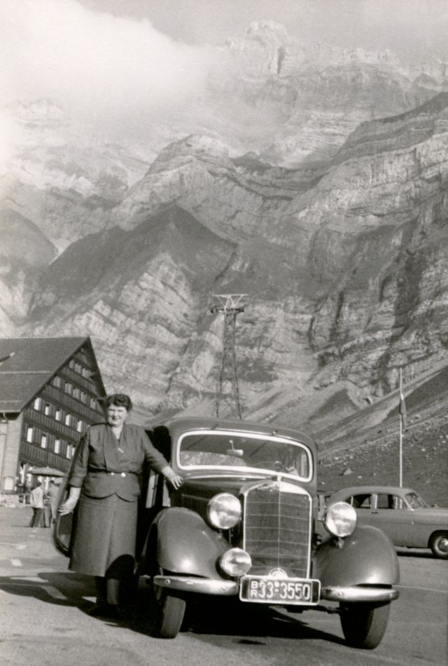 A middle-aged lady posing with a Mercedes-Benz 170 V in an Alpine setting, circa 1950