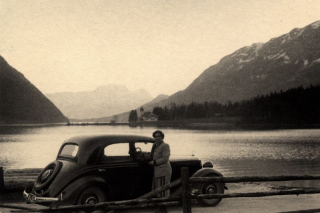 A middle-aged lady posing with a Mercedes-Benz 170 V on the bank of an Alpine lake. The building in the centre of the picture is Schloss Grundlsee. The car is registered in the city of Vienna, April 1950