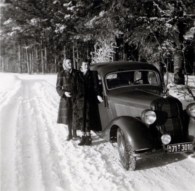 Two elegant ladies posing with a Mercedes-Benz 170 V on a snow-covered road in the countryside, circa 1950
