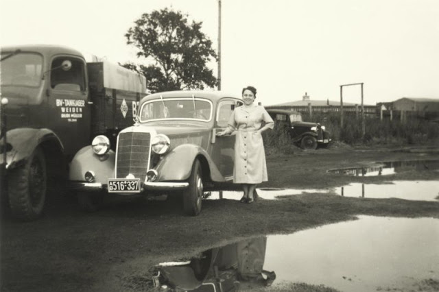 A lady dressed posing with a Mercedes-Benz 170 V on a gravel road in the countryside. The car is registered in the town of Darmstadt with black license plates of Allied-occupied Germany, circa 1952