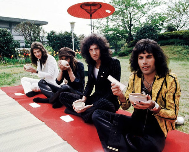 In the spring of 1975 Queen set foot as a band for the first time in Japan much to the delight of their legions of fans there. The band played their first of many gigs at Budokan after the release of 1974’s Sheer Heart Attack and the footage from the show is truly something to behold as are the images of the then 29-year-old Mercury sitting along with his bandmates and a few lovely geishas at a formal ceremony on the grass in front of the Tokyo Tower.