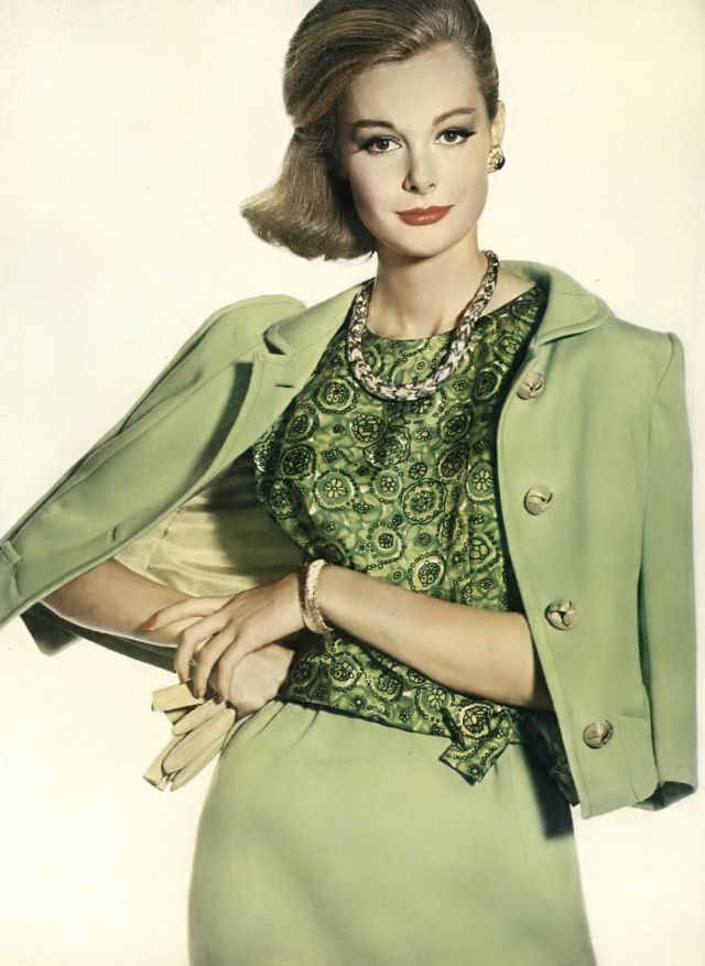Monique Chevalier in almond-green wool jersey suit with sleeveless silk paisley blouse by Frechtel, coiffure by Charles of the Ritz, photo by Irving Penn, Vogue, December 1, 1961