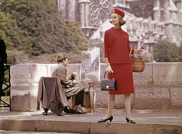 Monique Chevalier in bright red ribbed wool suit by Dick Dumas for P.R.I. Designs, 1958