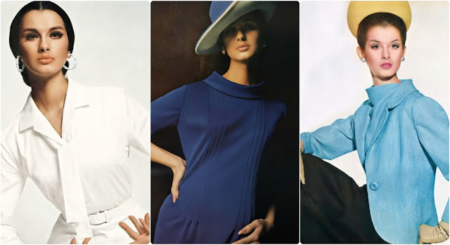 | Veronica Hamel in black crêpe cocktail dress with the Queen Anne collar to be worn up or down by Lee Claire, Harper’s Bazaar, October 1964 |