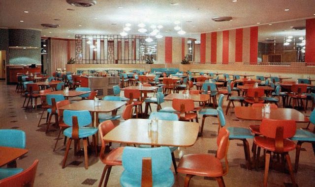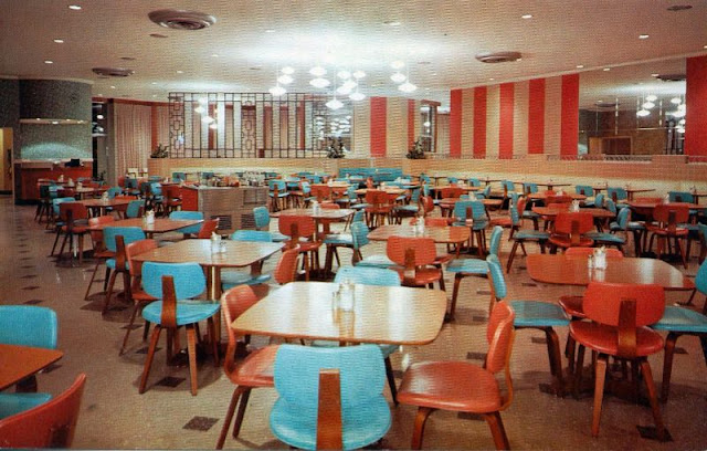 Here below is a set of vintage postcards that shows the inside of American cafeterias in the 1950s and 1960s.