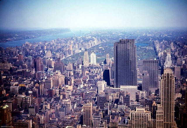 | Looking northwards toward Central Park from the Empire State Building, that is the Hudson River on the left, with the George Washington Bridge in the distance, 1941 |
