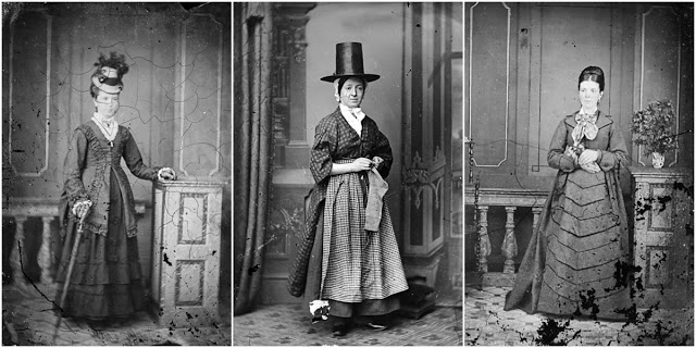 He started as a traveling photographer in 1863 and charged 6d for each portrait. Many of the younger women were photographed outside (providing natural light) with a crudely painted backdrop and mud floor. They all wore a combination of three sets of costume which they presumably borrowed from the photographer. The costumes consist of bright patterned bedgowns with large collars of the north Wales type, either mottled or spotted; an apron of bold check or horizontal stripes and a skirt of vertical stripes either light on dark or dark on light. They didn’t wear a shawl: the neckerchief seems to differ from one subject to the next and the stockings are different (i.e. these belonged to the subjects). Most, but not all wore a frilled cap under a Welsh Hat.
