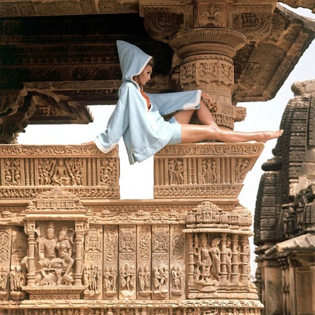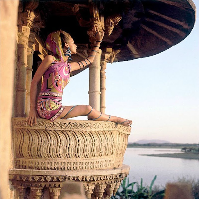 Samantha Jones in a hooded silk jersey chemise by Emilio Pucci, photo by Henry Clarke in Udaipur, India, Vogue, June 1, 1967