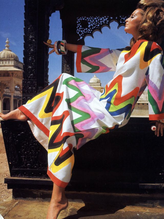 Samantha Jones in caftan-inspired dress in colorful hand printed zigzag by Livio de Simone, rings and bracelets by Tiziani, photographed by Henry Clarke in Udaipur, India, Vogue, 1967