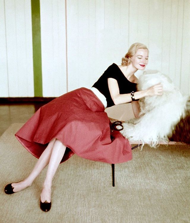 Sunny Harnett in a red canvas skirt and black jersey top is petting a white wooly dog, photo by Richard Rutledge, Vogue, 1951
