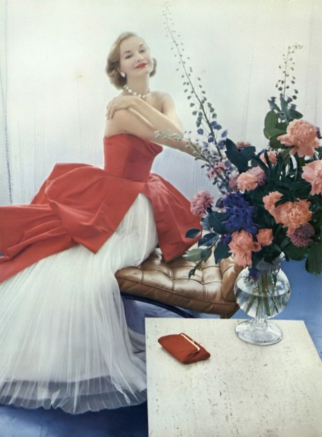 Sunny Harnett in beautiful gown of red silk taffeta and white nylon tulle by Ceil Chapman, velvet clutch by Ingber, photo by Richard Rutledge, August 15, 1951