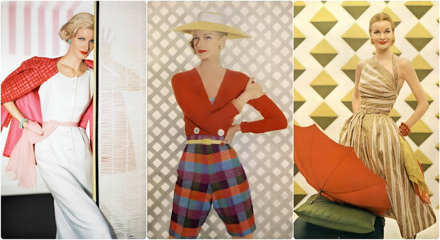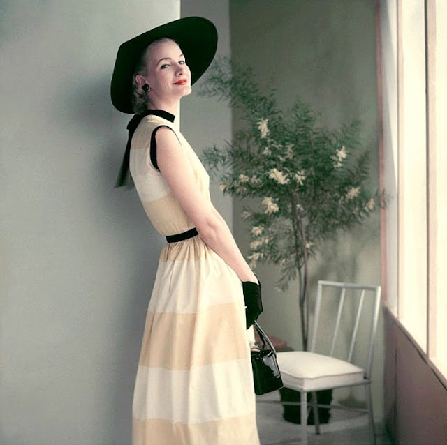 Sunny Harnett in batiste halter neckline dress in “Directoire Stripe” pattern by Claire McCardell, photo by Richard Rutledge, Vogue, April 1, 1951